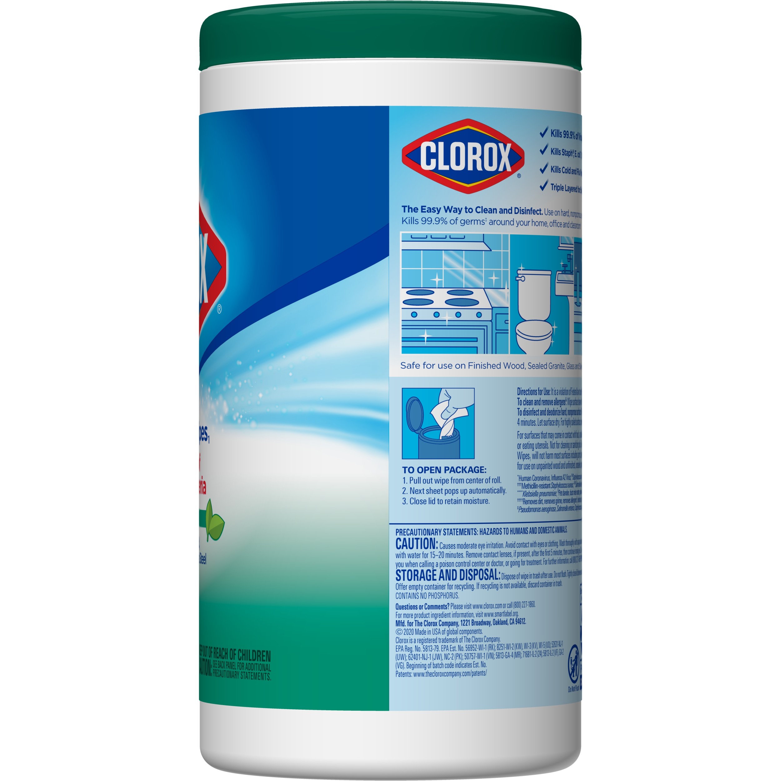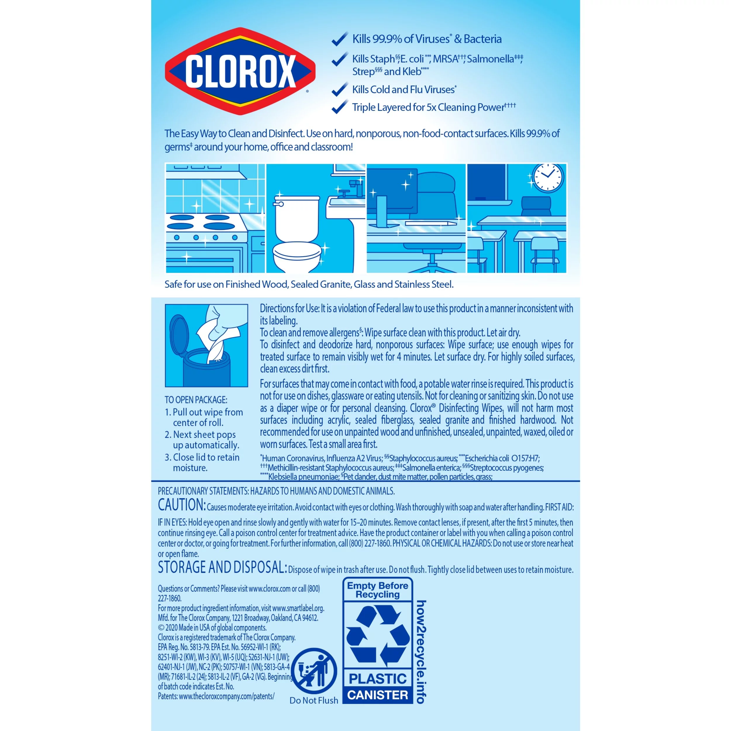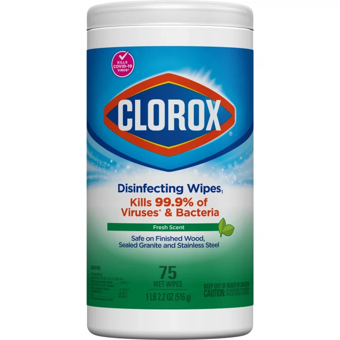 Clorox Disinfecting Wipes clean, disinfect, deodorize and remove allergens for 5x cleaning power* and leave a fresh scent. Disinfecting Wipes clean and disinfect with antibacterial power that kills 99.9% of viruses and bacteria that can live on surfaces, including COVID-19* Virus, staph, E. coli, MRSA, salmonella, strep and Kleb. These all-purpose disposable wipes remove common allergens, germs and messes on surfaces like kitchen counters, bathroom surfaces and more and can prevent the growth of bacteria* for up to 24 hours. Wipes are safe to use on finished wood, sealed granite and stainless steel. Clean with bleach-free wipes to keep dirt and germs away. *5x cleaning power: cleans, disinfects, deodorizes, removes allergens, leaves a scent, removes dirt, removes grime. Kills COVID-19 virus: kills SARS-CoV-2 on hard, nonporous surfaces. Use as directed. Prevents the growth of bacteria: odor causing bacteria on non-food contact surfaces. Allow product to air dry.