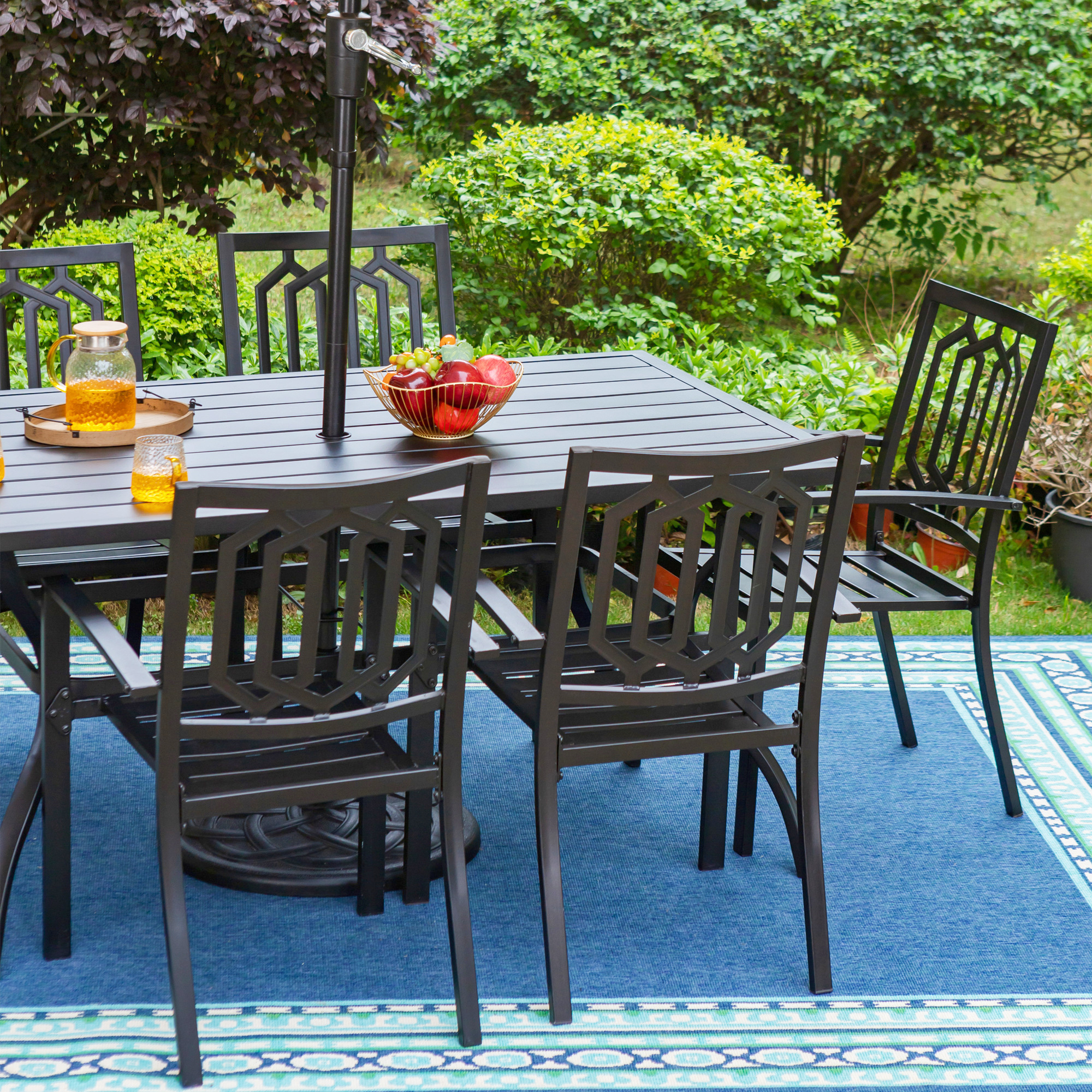 his MF Studio 8-Piece patio dining set with umbrella is ideal for your family/friends gathering, party, dinner and conversation. It includes one large rectangular dining table, one large 13ft patio umbrella and six armchairs. Made of heavy-duty steel frame with excellent E-coating finish, it offers supportive structure and stands up to outdoor elements for reliable long-lasting strength. The chair features a clean-lined design of stripes and slats with perfect powder coated finish for an elegant aesthetic that provides with nicely seating experience and will certainly decorate your patio&yard. Chairs can be easily stacked up and conveniently stored. The 13 ft double-sided patio umbrella is assembled onto the table top that offers an easy, fast and efficient shade solution, protecting your family/friends away from the harmful UV rays. The umbrella consists of 12 reinforced ribs and 1.5″ diameter pole which has a strong frame and made of durable 180 G polyester fabric, it provides with up to 99% UV protection, water-proof and fade-proof perfectly. This MF Studio outdoor set is a gorgeous addition for summer. Don’t hesitate to take them home.