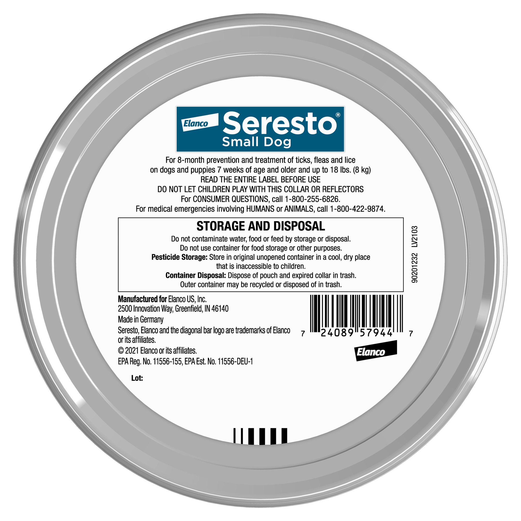 Seresto Flea and Tick Collar for Small Dogs up to 18 pounds provides continuous 8-month flea and tick protection. Unlike oral flea and tick prevention products that require a bite, the Seresto collar repels fleas and ticks and kills through contact; no biting required. Seresto dog flea collars are made with a long-lasting, 8-month formula for continuous release coverage over your dog’s skin and coat. Vet recommended Seresto collars are water-resistant* and remain effective after shampooing, swimming or exposure to rain or sunlight. This flea and tick collar for small dogs is odorless, non-greasy, easy to apply and can be used alongside other identification or restraining collars without damaging them. Avoid the hassle of messy monthly treatments and get the effective protection of Seresto for small dogs.*Dogs must not be bathed more than once per month. For dogs that swim once a month or more, the controlduration is reduced to five months of flea control and seven months of tick control.
